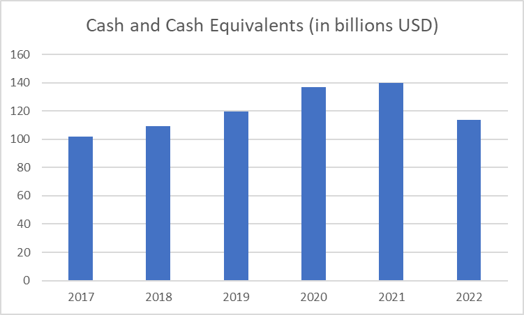 As of December 31, 2022, Alphabet held a cash stockpile of 113 billion dollars. Given that the working capital of the company is negative, there is no need to hold as much cash.