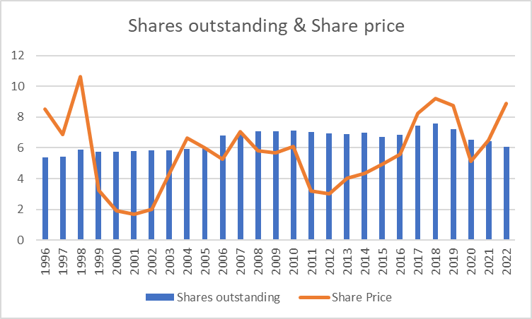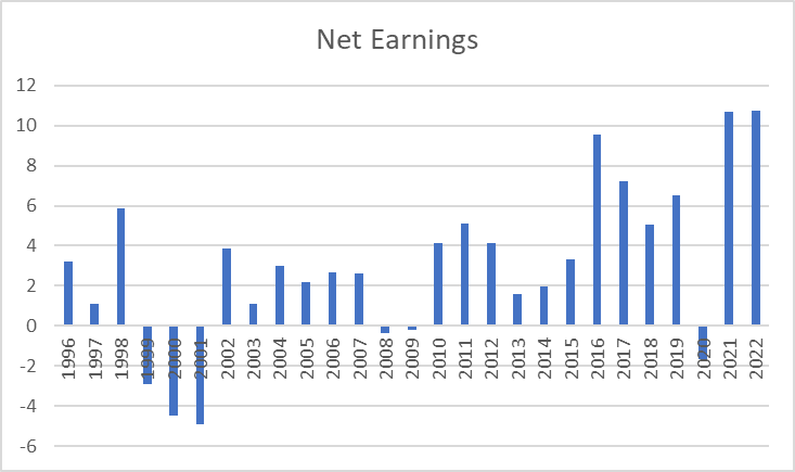 Furthermore, the company has demonstrated a commendable ability to create value for shareholders. Over a span of 26 years, the company has compounded book value at a rate of 6.5%. Additionally, the company has historically maintained a Return on Equity (ROE) of about 10-12%, which has improved in recent years.
