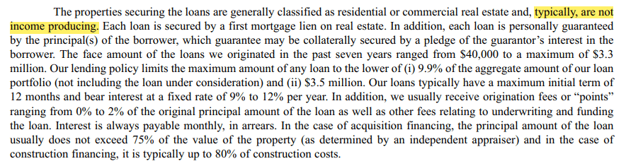 Having uncertainties about my current position, I opted to conduct a more in-depth analysis of the hard money lending industry. In this exploration, I discovered a competitor—Manhattan Bridge Capital—that functions in nearly identical markets but is notably smaller in scale and exhibits lower leverage. Here are some noteworthy points I found during my research on this competitor.