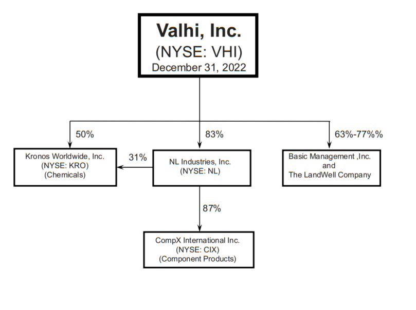 Valhi is a holding company that holds a controlling interest in Kronos Worldwide, a prominent producer of titanium dioxide (TiO2), and also has investments in NL Industries and COMPX International. The corporate structure, when visualized, is relatively straightforward, and for clarity, an illustrative representation is provided below: