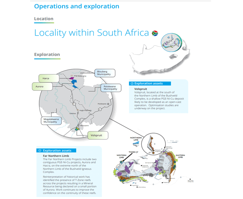 The Volspruit Project is currently on stand-by due to several factors. The site exhibits low in situ grades, and the development of capital-intensive, in-house smelting, and refining facilities would be necessary. The project does not appear economically viable, particularly in the current depressed price environment. This is attributed to its requirement for high stripping ratios and its modest concentration of valuable minerals. Similar considerations apply to the Far Northern Limb Projects.