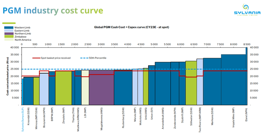 At present prices, it’s difficult to envision how major producers, particularly Impala and Anglo American, which collectively contribute approximately 50% of PGM supply, will be able to achieve positive Gross Margins. However, Sylvania is expected to fare relatively well even at current price levels.