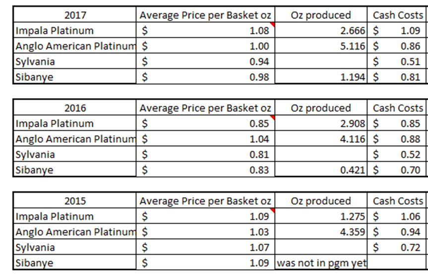 (Note: I calculate Cash Costs as Gross Costs divided by PGM production. For diversified miners such as Sibanye, I utilized the Cash Cost figure stated in their Annual Reports.)
