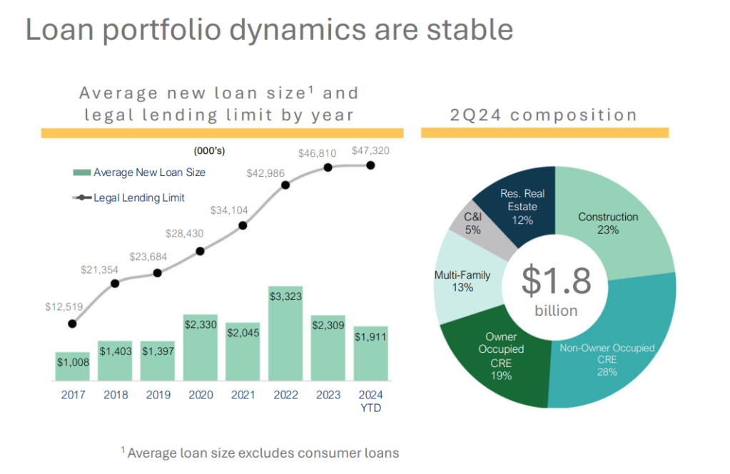 The bank’s loan portfolio is moderately aggressive. While 50% of the portfolio is conservative, the remaining portion includes higher-risk loans such as Construction and Non-Owner Occupied Commercial Real Estate (CRE). However, the bank mitigates this risk by charging appropriately higher interest rates, balancing the potential risks with returns.