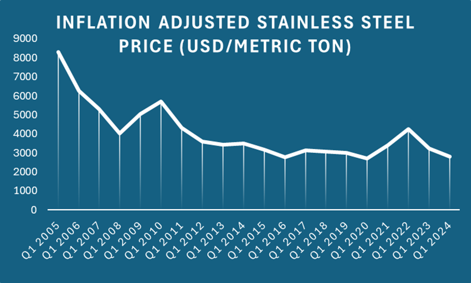 Notice the massive working capital buildup when prices were extremely high (2005-2009 and 2021-2022) and the subsequent violent release of working capital to get rid of higher-priced inventory. As you can see (and we’ll return to that later), not much happened during the 2010s for stainless steel. In fact, on a real basis, we’ve never reached the peaks of 2005 or 2008, and I don’t expect to see such prices in the future.