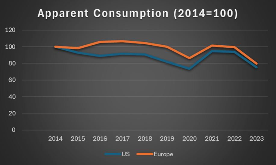 I am not entirely sure about the data on the US, and I suspect apparent consumption is much higher than stated (although it seems credible, because it’s more or less on par with Europe). It’s more difficult to extract information from the annual reports of the major producers since they are very Europe-centric.