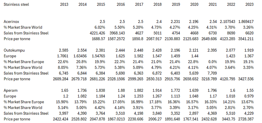 As you can see, Outokumpu is the biggest player in Europe and the second largest in the US. Aperam is a significant player in Europe and an important player in the US, especially with their recent acquisition of Universal Stainless & Alloy Products. The Spanish-based Acerinox is the second largest in Europe and the largest in the US. I’m not 100% sure of the market share numbers but take them as a reference if you wish; it’s not of major importance since they’ve all lost market share to China on the world stage while keeping their market share fairly stable among themselves.