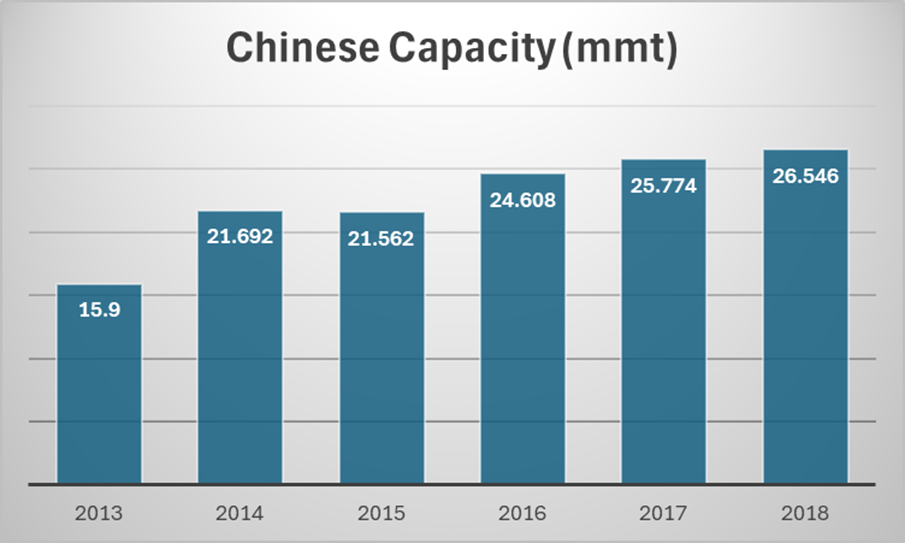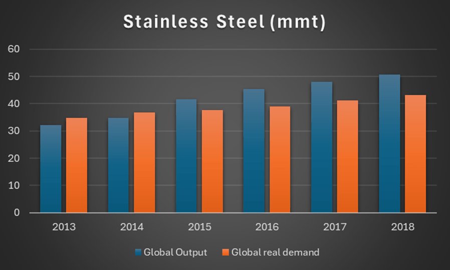 For illustration, reviewing global stainless steel capacity against demand from 2013 to 2018—as well as China’s specific capacity—shows a significant mismatch (data sourced from the annual reports of the top three producers and supplemented by World Steel Organization reports; these figures may not be fully accurate but are the best available freely). This period was indeed a lost decade for stainless steel profitability, as producers worldwide (except for China) faced tough market conditions and operated under suboptimal production circumstances.