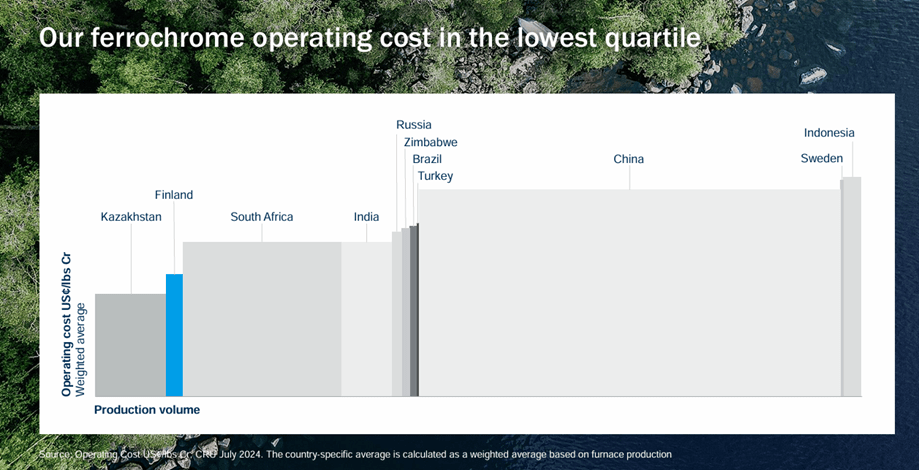 The Kemi mine is by far the most interesting asset. It is the largest ferrochrome producer in the Western world, and as you know, ferrochrome is absolutely critical for making stainless steel. Kemi is the only ferrochrome mine within the EU and is set to become the world’s first carbon-neutral mine by 2025. With recent investments, the mine’s life has been extended to 2050, which is significant. This extension allows the company to benefit from a high level of integration and a secure supply of such a crucial mineral. It’s worth noting that most ferrochrome in the EU is imported from South Africa, where production capacity is being reduced. Kemi’s production accounts for 3% of global ferrochrome output and has one of the lowest cash costs in the industry.