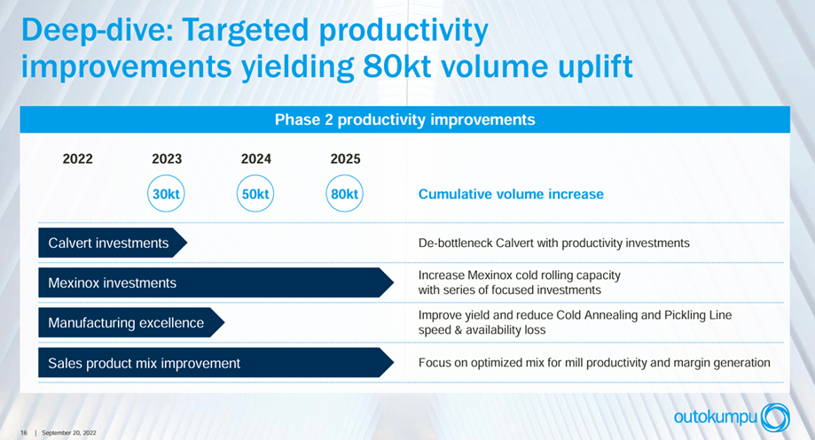 The Calvert stainless steel mill has historically weighed on profitability, but it has performed relatively well since 2020 and is expected to improve further as Outokumpu plans to increase vertical integration in the U.S. This facility has focused on growing key customer relationships and becoming a reliable supplier for large distributors with high customer service expectations. This shift has been a learning experience for the company, as European distributors tend to be smaller with less bargaining power. The company has adapted well, and I expect profitability to improve relative to historical levels. Additionally, Outokumpu has worked on debottlenecking operations to enhance productivity.