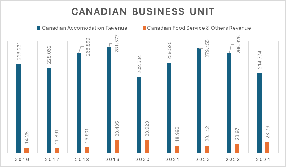 The particularity here is that Canadian food service and other services in third-party lodges are doing just fine, but the accommodation revenue from its lodges peaked in 2019 and is down 25% since, which is a lot for a recurring business. The Food & Service business is steadily recovering but also far from peak.