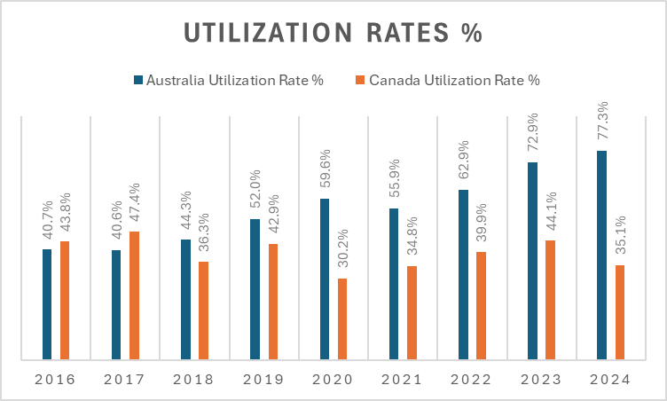 For Australia, the utilization rate is about 77%, which would equate to about a 15% annualized return on capital. For Canadian accommodations, it is 35%. Let that sink in. Assuming a linear relationship between utilization and return on initial investment capital, this would mean a 6.5% return on initial investment. This is bad. I hope I have massively understated utilization; otherwise, this is dragging down the Australian business massively.