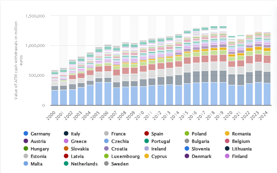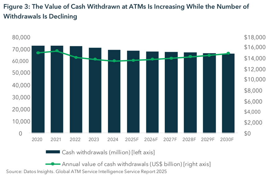 On the cash narrative: cash is far from dead. Around 90% of global transactions are still settled in cash. While ATM transaction counts are gradually declining, the value of those transactions is actually rising.