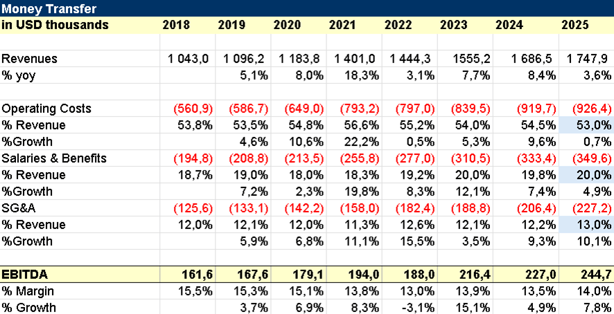 Historically, growth has been modest, around 7.6% CAGR, with slight margin compression. This is expected in a competitive environment, where digital-native players like Wise are lowering take rates to gain market share.