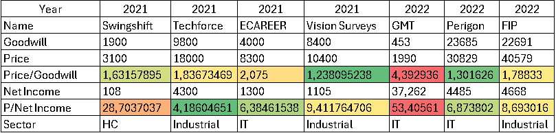 Due to the fragmented nature of the industry, PeopleIN has engaged in substantial M&A. To assess the price paid for individual businesses, I have focused on the multiple of goodwill, as these are relationship-heavy businesses where value resides primarily in goodwill.